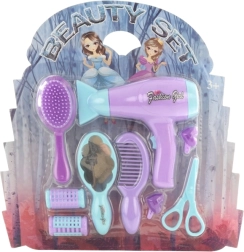 Im Lieferumfang enthalten sind ein realistischer Föhn für 2 AA-Batterien (nicht enthalten), ein Kamm, eine Bürste, 2 Lockenwickler, 2 Haarspangen und eine Schere – alles an Kinderhände angepasst. Die praktische Verpackung mit den Maßen ca. 32 × 38 cm ist ideal als Geschenk.
