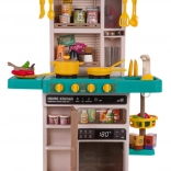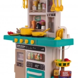 Diese Kinderküche bietet dank beleuchteter Kochfelder, drehbarer Knöpfe sowie Brat- und Kochgeräuschen ein realistisches Kocherlebnis. Aus einem Brenner entweicht sanfter Wasserdampf, der das Erlebnis noch intensiver macht. Der Wasserhahn mit fließendem Wasser ermöglicht es kleinen Köchinnen und Köchen, Geschirr wie in einer echten Küche abzuspülen.