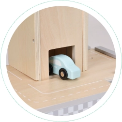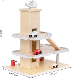 Mit dabei sind ein Hubschrauber mit Landeplatz auf dem Dach, 4 Autos, eine Tankstelle und eine bewegliche Schranke für besonders realistisches Spiel. Die hochwertige Holzausführung ohne scharfe Kanten sorgt für 100 % sicheres Spielen.