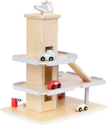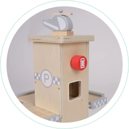 Dieses stilvolle Holzparkhaus begeistert jedes Kind, das Autos und kreatives Spiel liebt. Dank drei Ebenen, geschwungener Rampen und eines Aufzugs mit Halt auf jeder Etage bietet es stundenlangen Spaß und fördert Feinmotorik und Fantasie.