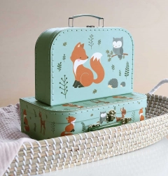 Niedliches Set aus zwei Kinderkoffern mit Waldtier-Motiv von A Little Lovely Company. Ideal für Spielzeug, Kleinigkeiten und Bastelsachen. Hergestellt aus robustem Karton mit Polyester-Steppung, mit Metallgriff und Verschluss für sicheres Schließen. Praktisch, leicht und dekorativ fürs Kinderzimmer und für unterwegs.
