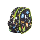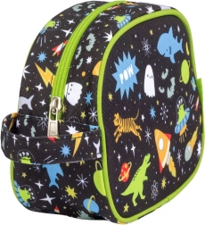 Bunte Raketen, Planeten und Sterne auf dunklem Hintergrund machen jedes Packen zum Abenteuer.