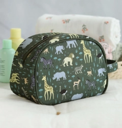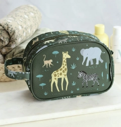 Stilvolles und praktisches Kinder-Kulturtäschchen mit fröhlichen Motiven von Giraffe, Zebra, Löwe und weiteren Savannenbewohnern. Dank der kompakten Maße passt es in Rucksack und Koffer und hält alle Hygieneartikel ordentlich zusammen.