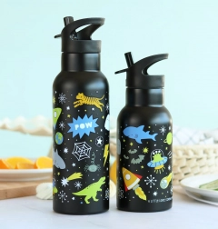 Bunte Raketen, Planeten und Sterne motivieren zu regelmäßigem Trinken und machen die Flasche zum Lieblingsaccessoire.