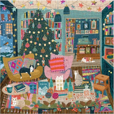 Erleben Sie festliche Stimmung mit dem GALISON-Puzzle Season’s Readings, das ein gemütliches Interieur mit Weihnachtsdeko, Bücherregalen und Katzen zeigt. Der Folieneffekt verleiht dem Bild einen außergewöhnlichen Glanz und macht das fertige Puzzle zu einem dekorativen Bild, das Ihr Zuhause nicht nur zu Weihnachten erstrahlen lässt.