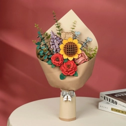 Entdecken Sie den Zauber eines Blumenstraußes, dessen Schönheit nie verblasst. Das Holz 3D Puzzle beinhaltet Sonnenblume, Flieder, rote Kamelie, rosa Rose und Eukalyptus. Jede Blume hat eine verstellbare Stiellänge, was vielfältige Arrangements ermöglicht.