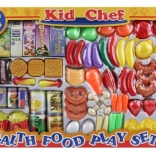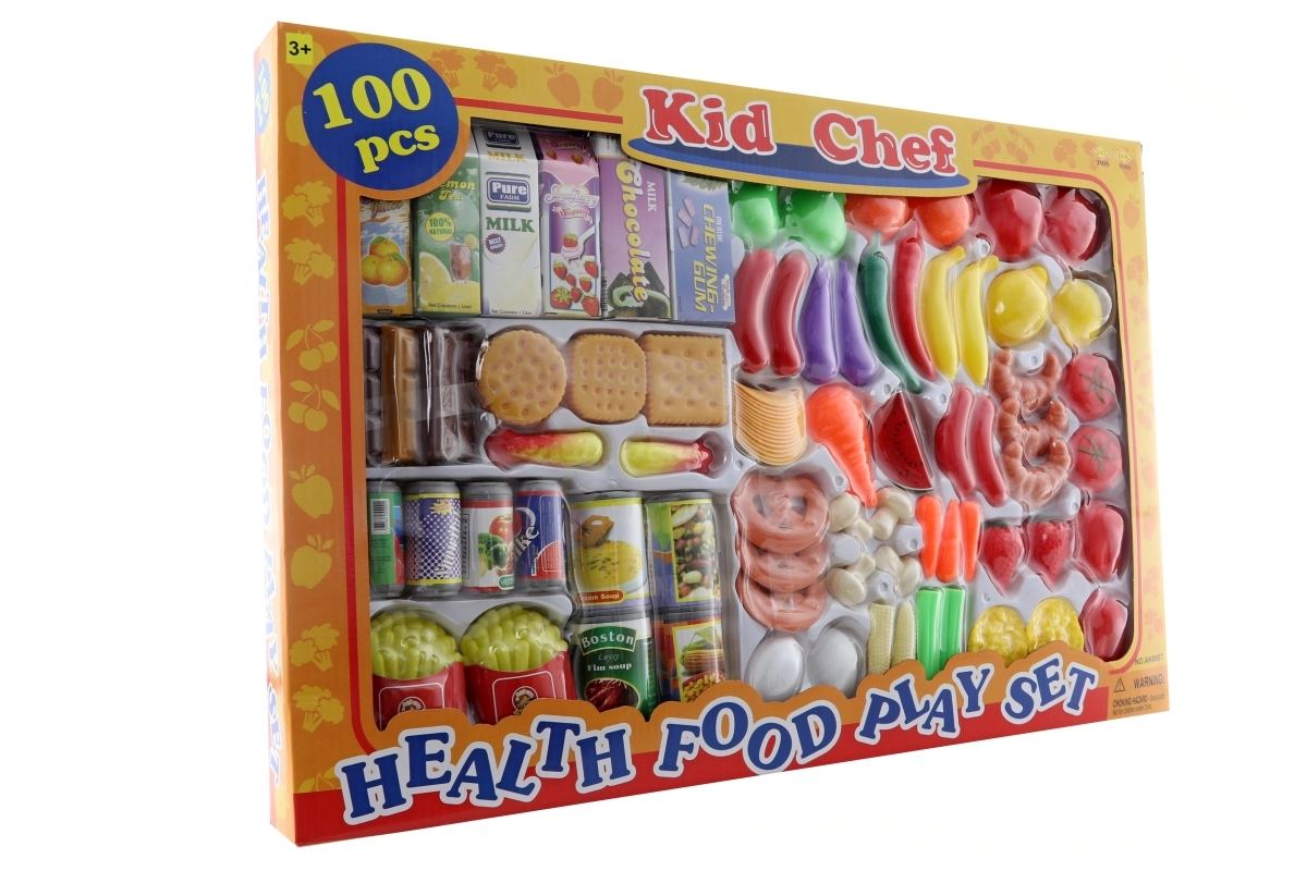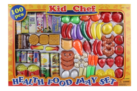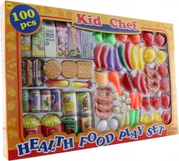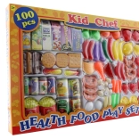 Großes Essensset. Die Packung enthält insgesamt 100 Teile (Obst, Gemüse, Backwaren, Süßigkeiten, Dosen und Getränke in Kartons). Packungsmaße ca. 58 × 39 × 5 cm. Alter 3+