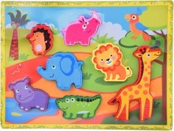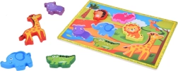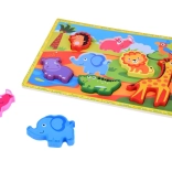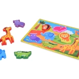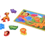 Der Holz Einleger Safari verbindet Spielen mit Lernen. Kinder üben die Fähigkeit zum Vergleichen und zur Koordination, während sie die Namen von Zootieren lernen. Das Puzzle ist aus hochwertigen Materialien gefertigt, hat keine scharfen Kanten, was Sicherheit gewährleistet. Große, massive Teile lassen sich leicht greifen und in die Öffnungen einsetzen.
