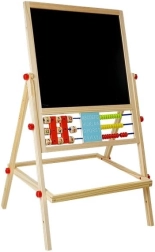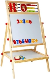 Die Tafel ist ein unverzichtbares Zubehör: Kleine Künstlerinnen und Künstler entwickeln ihre kreativen Fähigkeiten mit Kreidezeichnungen und können auch Schreiben und Rechnen lernen. Sie ist mit einer praktischen Ablage für Zubehör ausgestattet. Robust gefertigt aus Materialien höchster Qualität. Sorgfältig verarbeitet, ohne scharfe Kanten. Für die schwarze Seite der Tafel verwenden Sie Kreide – im Set sind drei Farben enthalten. Ein Abakus mit Kugeln in 3 Farben lädt zum Rechenabenteuer ein, und auf der anderen Seite befinden sich Holzwürfel mit Zahlen, mit denen sich Grundrechenarten leicht üben lassen. Mit Zahlen und mathematischen Zeichen als Magnete kann das Kind Grundrechenarten wie Addieren, Subtrahieren und Multiplizieren lernen. In der Mitte befindet sich eine Uhr, an der das Kind mit Hilfe der Zeiger die Zeit einstellen und die Uhr lesen lernen kann.