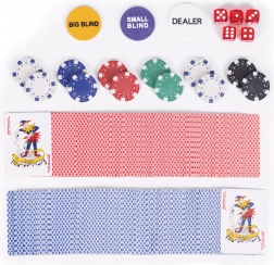 Enthält 500 Chips, 2 Kartendecks, Würfel und eine Spielmatte. All dies in einem praktischen abschließbaren Koffer.