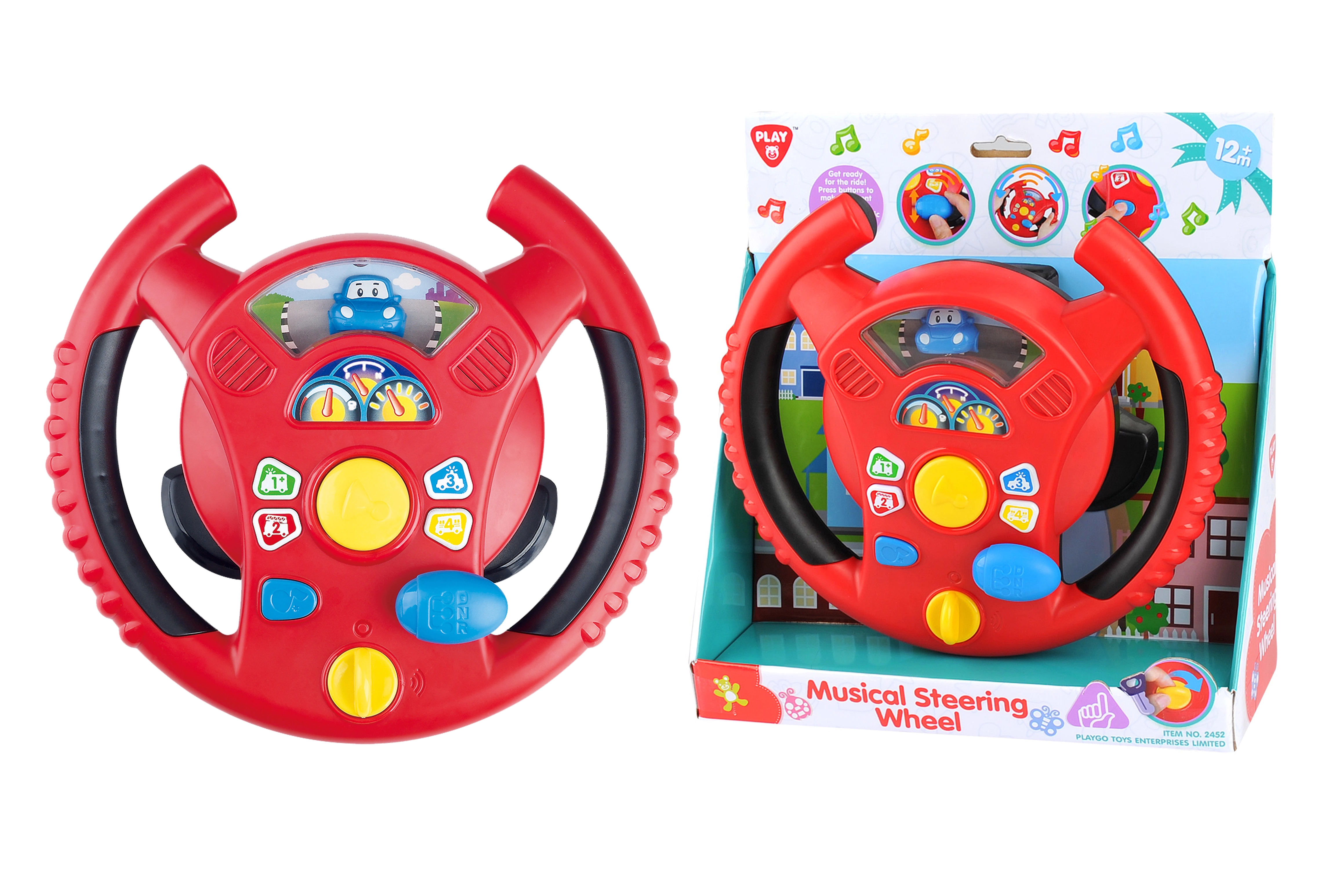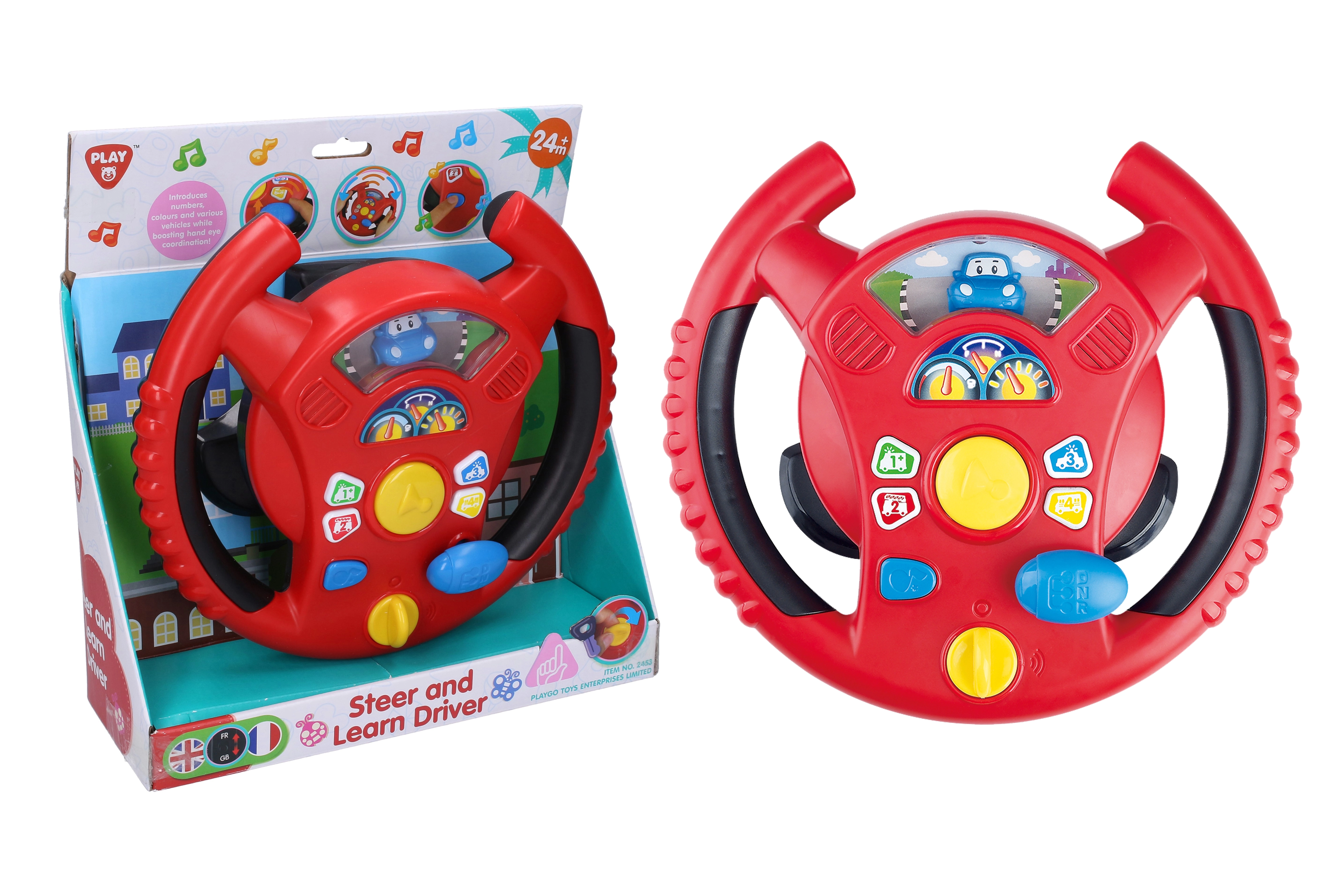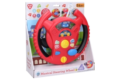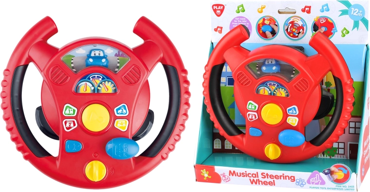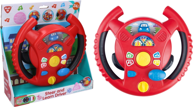 Das interaktive Lenkrad von Playgo bringt Kindern ein unterhaltsames Rollenspiel als Fahrer in einer Mini-Stadt. Ein Drehschalter an der Unterseite des Lenkrads dient zum Einschalten, in der Mitte befindet sich die Hupe, rechts ein Schalthebel für Fahrgeräusche und am Lenkradkranz kleine Tasten mit Tönen und Melodien. Kinder genießen realistische Effekte, die an ein echtes Auto erinnern, und entwickeln dabei Koordination und Vorstellungskraft.