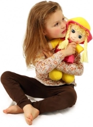 Fröhliche Farben, Zöpfe und ein Blümchen-Hut regen zum Spielen an und unterstützen die Sinneswahrnehmung der Kinder.