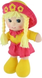 Eine niedliche Stoffpuppe mit langen Zöpfen und einem blumigen Hütchen hat einen weichen Körper aus zartem Material und ist ideal zum Kuscheln, fürs Bettchen und für unterwegs. Dank der Größe von 35 cm liegt sie auch den Kleinsten gut in der Hand und ist ab 0 Monaten geeignet.