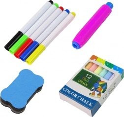 Im Set finden Sie ein komplettes Paket: die Tafel mit Standfüßen, 5 verschiedene farbige Marker (blau, rot, gelb, grün, schwarz), einen praktischen Schwamm zum Reinigen sowie 12 bunte Kreidestücke (je 2 pro Farbe) zum Schreiben auf der schwarzen Seite. Ein Kreideschutz ermöglicht zudem das Malen, ohne sich die Hände schmutzig zu machen, und ein Set aus Magneten mit Buchstaben, Zahlen und Zeichen sorgt für dynamischen und interaktiven Unterricht.