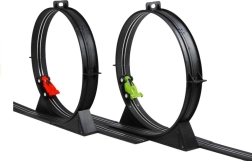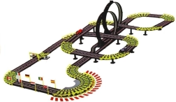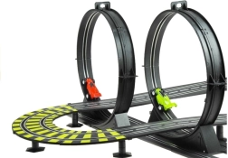 Das unterhaltsame Rennset für Kinder und Erwachsene bietet eine fast 12 Meter lange Strecke mit zwei Loopings, Rundenzählern und 230-V-Netzbetrieb ganz ohne Batterien. Enthalten sind 2 Rennautos, schützende Leitplanken, eine Brücke, Tribünen und ein Tunnel – alles für rasante Duelle und sicheres Fahren in scharfen, gelb markierten Kurven.