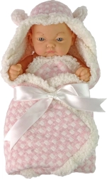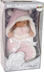 Die Puppe ist in eine warme rosa Wickeldecke mit weißer Schleife gekleidet. Sie hat bewegliche Arme, was die Interaktivität und das realistische Aussehen des Spiels erhöht. Sie ist aus zertifizierten Materialien von hoher Qualität gefertigt, die Sicherheit und Langlebigkeit des Spielzeugs gewährleisten.
