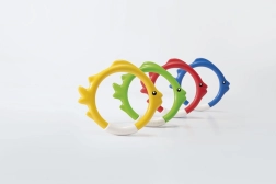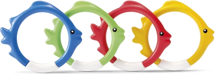 Lustiges Set aus vier Tauchringen in Fischform für Kinder ab 6 Jahren. Die Ringe in Blau, Rot, Grün und Gelb stellen sich nach dem Einwerfen ins Wasser stabil auf den Beckenboden, was zum Tauchtraining motiviert und die Schwimmfertigkeiten verbessert. Hergestellt aus weichem und sicherem Material für leichtes Greifen.