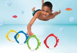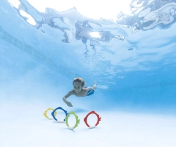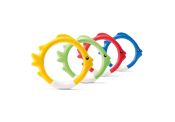 Das Set der IN TEX Tauchringe in Fischform ist ein ideales Hilfsmittel für spielerisches Tauchenlernen. Dank der auffälligen Farben und der stabilen Stellung auf dem Beckenboden finden Kinder ihr Ziel leicht und trainieren motiviert das Luftanhalten sowie die Orientierung unter Wasser.