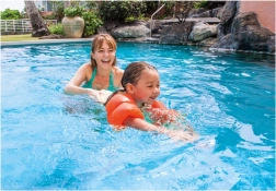 Dank dieser Schwimmflügel können Kinder fröhliche Momente im Wasser erleben, während sie unter Aufsicht das Schwimmen erlernen – wie das entspannte Bild am Pool zeigt.