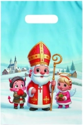 Die Tasche besteht aus stabilem Kunststoff, der reißfest und feuchtigkeitsbeständig ist. Das praktische Griffloch im oberen Bereich dient als Tragegriff für komfortables Transportieren. Der Farbdruck mit Nikolaus, Engel und Teufel verleiht jedem Paket eine festliche Note.