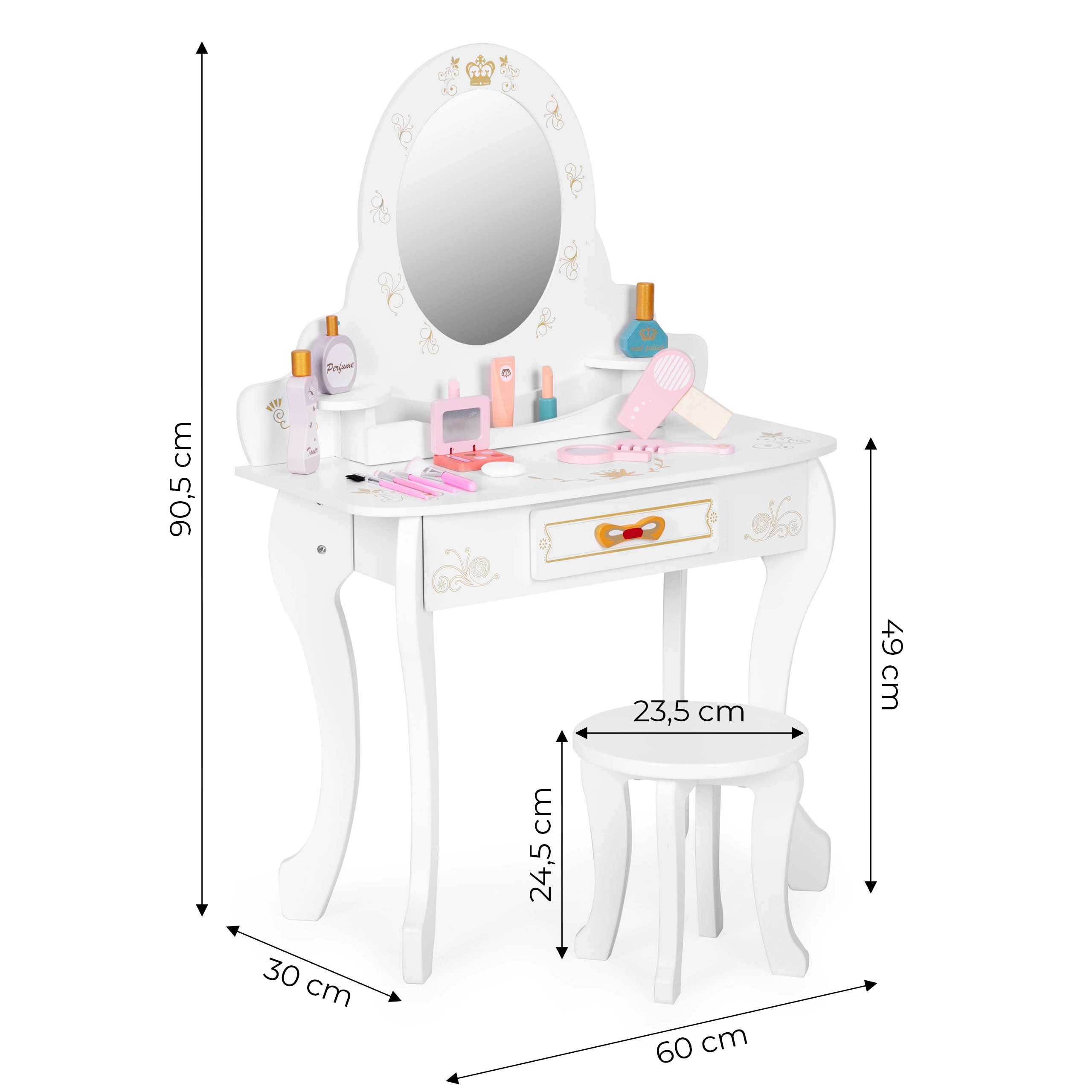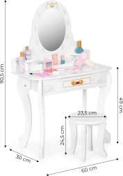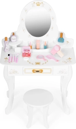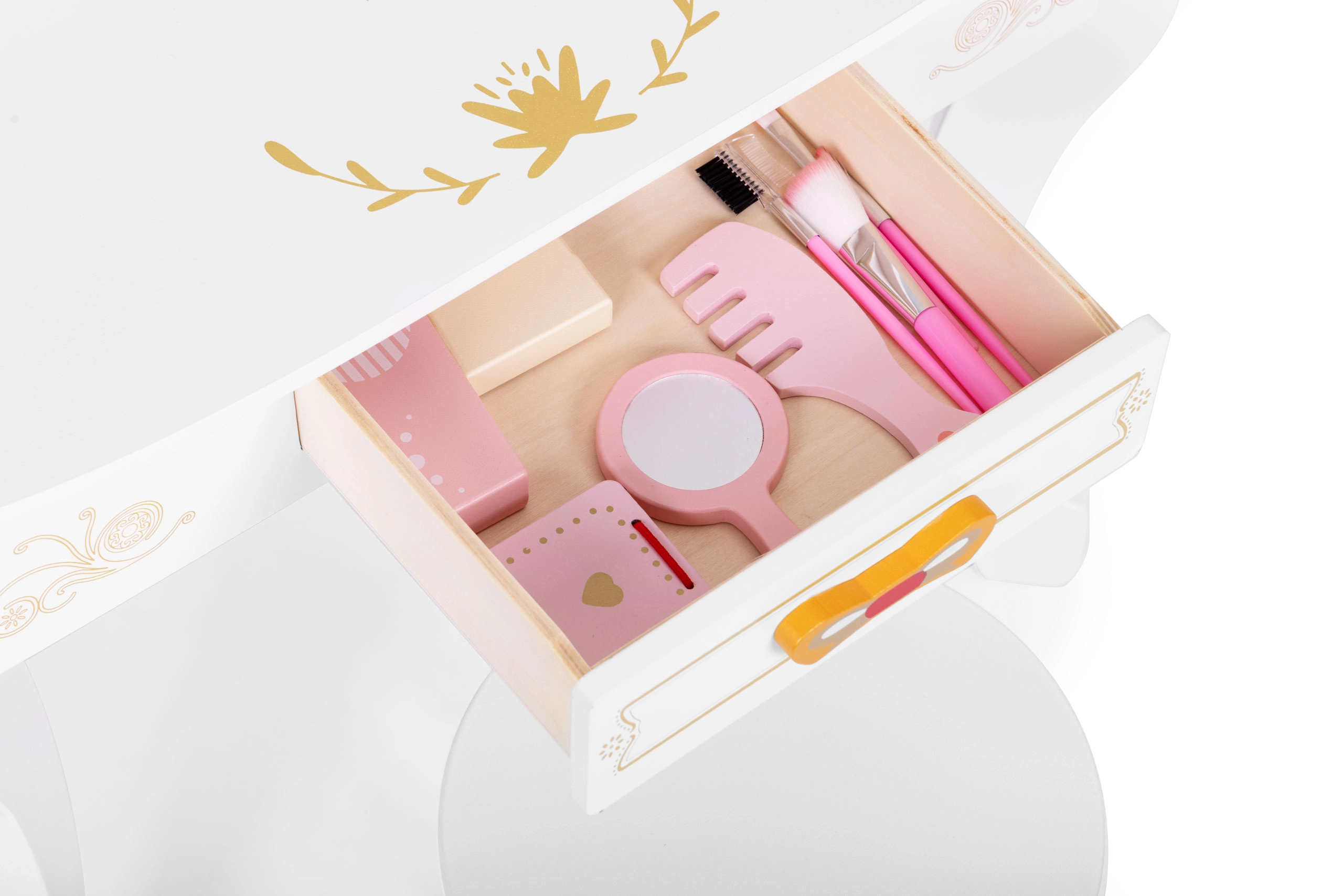 Der Schminktisch ist mit Spielzubehör ausgestattet, wie zum Beispiel: