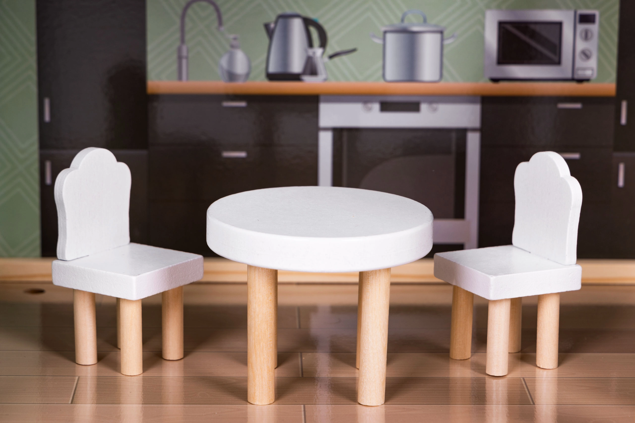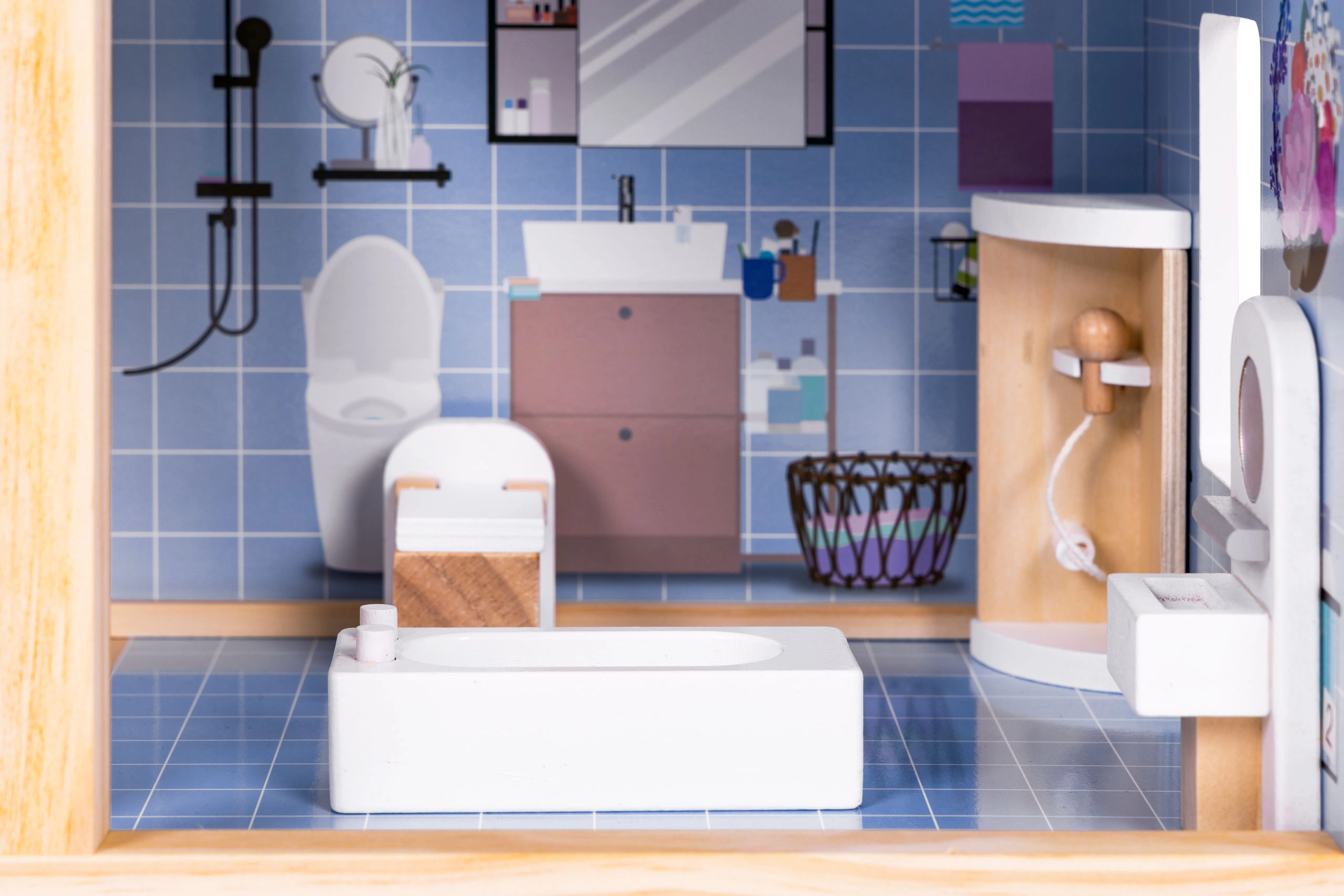 Zum Set gehört außerdem eine Kollektion aus 15 Teilen Holzmöbeln, die nach Belieben herausgenommen und ohne Einschränkungen umgestellt werden können.