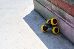 Dank großer, strapazierfähiger Reifen kann sich Flippy auf nahezu jedem Untergrund bewegen, was es ideal für Stunt-Tricks macht.
