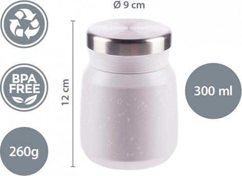 Ein hochwertiger Thermobehälter für Mahlzeiten und Brei mit einem Volumen von 300 ml hält warmes Essen bis zu 12 Stunden und kaltes bis zu 24 Stunden. Er besteht aus hochwertigem Edelstahl, der korrosionsbeständig ist. Der dichte Deckel sorgt dafür, dass der Thermobehälter nicht ausläuft. Dank der Vakuumisolierung erwärmt sich die Außenfläche bei heißem Inhalt nicht.
