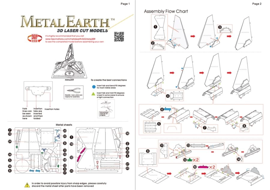 Entnehmen Sie die einzelnen Teile aus den Metallplatten, bei Bedarf mit kleinen Seitenschneidern (nicht enthalten). Die Teile werden mittels Verriegelungen verbunden, die aus einem Haken (Nase) und einer Öffnung bestehen. Biegen Sie die Nase mit einer kleinen Spitzzange (nicht enthalten) um und verbinden Sie nach und nach alle Verriegelungen, bis ein sehr realistisches Meisterstück entsteht!