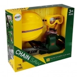 Das Set enthält eine grüne Motorsäge, einen gelben Schutzhelm, eine Brille und bunte Handschuhe für Gartenarbeiten. Jedes Element ist so gestaltet, dass es so realistisch wie möglich aussieht und gleichzeitig absolut sicher für Kinder ist.