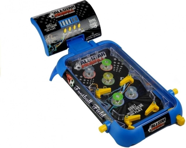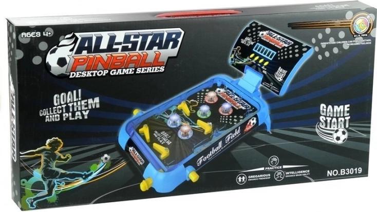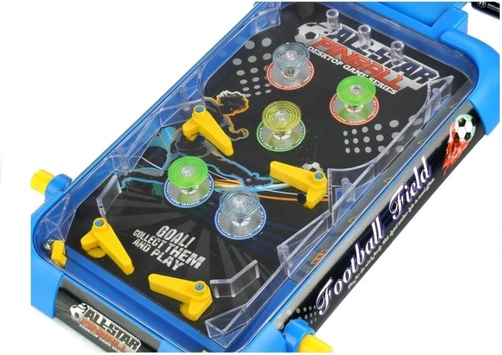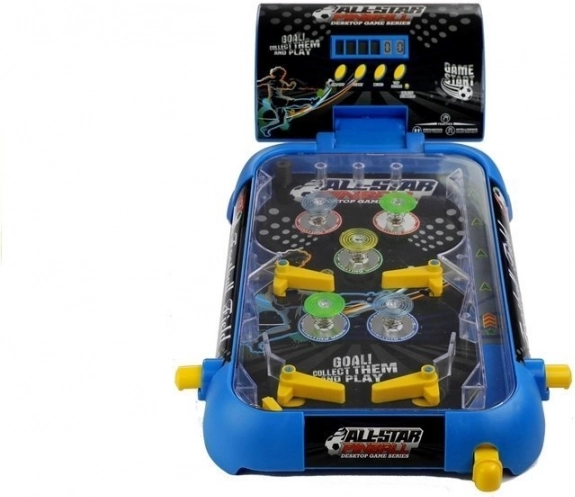 Das Design des Flipperspielzeugs sieht aus wie eine verkleinerte Version eines klassischen Automaten. Die Spielfläche ist mit zwei Beinen und einem Punktzähler verbunden, dessen Position der Spieler nach Bedarf anpassen kann. Dank der Beine ist das Board in einem Winkel aufgestellt, der großartigen Spielspaß sowie das Hochschleudern der Kugel ermöglicht. Ein großer Vorteil des Spielzeugs ist sein Design mit Fußballmotiven. Das blaue Gehäuse der Spielfläche ist mit einem dunklen Hintergrund kombiniert, der bei eingeschalteten bunten Lichtern sensationell aussieht. Nach dem Einlegen der Batterien drücken Sie die Taste ON/OFF und anschließend die danebenliegende START-Taste. Um dem Spiel zusätzliche Sounds hinzuzufügen, drücken Sie einfach die Musik-Taste. Die letzte Taste ist mit TOP SCORE beschriftet; nach dem Drücken wird die höchste erreichte Punktzahl angezeigt. Wir glauben, dass diese Funktion Sie motivieren kann, beim nächsten Spiel noch mehr aus sich herauszuholen. Bei Bedarf kann dieser Zähler zurückgesetzt werden, und das Spiel beginnt von vorn.
