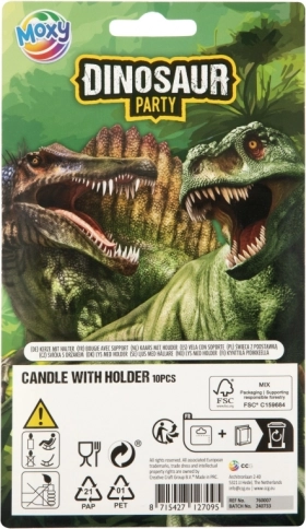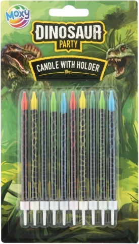 Tortenkerzen mit Dinosauriern mit Haltern, Länge ca. 10 cm, 10er-Pack. Ideal für Kindergeburtstage. Verpackungsmaße 11×20×0,5 cm. Produkt ist kein Spielzeug.