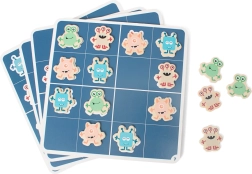Spieler ergänzen die Chips auf den Spielkarten so, dass sich keine Farbe in Reihe, Spalte oder Quadrat wiederholt – ideal zum Trainieren von Konzentration und Strategie.