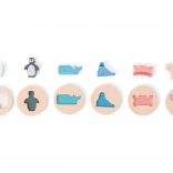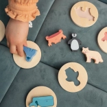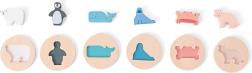 Dieses hochwertige Holzpuzzle verbindet Spiel und Lernen. Die Tiere – Seehund, Eisbär, Krabbe, Pinguin, Fuchs und Schwertwal – werden in runde Marken mit Umrissaussparung und passender Farbe eingesetzt, was die Orientierung erleichtert und die Erkennung von Farben und Formen stärkt.