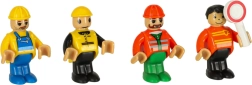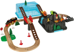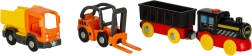 Lokomotive mit Waggon, Kran, Gabelstapler, 4 Figuren, 6 Bäume, 3 Verkehrsschilder, 4 Pylonen, Palette und Ladung, Aufbewahrungsbox, Schienenteile