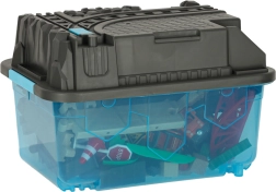 Die stabile blaue Box dient während des Spiels als Streckenelement und danach als praktische Aufbewahrung. So bleiben alle Teile an einem Ort.