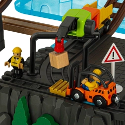 Ein funktionsfähiger Kran und ein Gabelstapler ermöglichen das Be- und Entladen. Kinder trainieren ihre Feinmotorik und erfinden eigene Geschichten aus der Bauwelt.