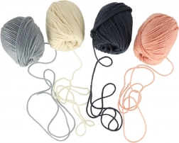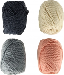 Entdecken Sie die Freude am Handarbeiten mit einem Set aus vier Garnen in sorgfältig abgestimmten Nuancen (Creme, Grau, Dunkelblau, Apricot). Dank der angenehmen Polyester-Acryl-Mischung verfilzt das Garn nicht, verknotet weniger und gleitet gut über Nadeln und Haken. Die Farben lassen sich hervorragend für kontrastreiche wie auch harmonische Muster kombinieren.