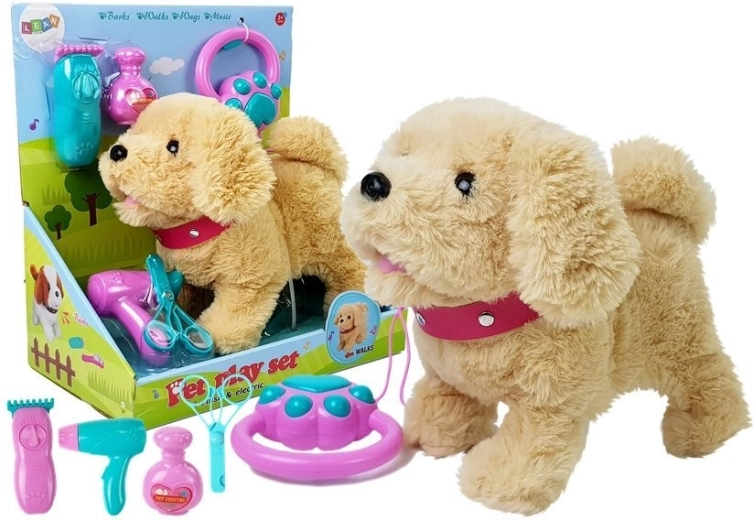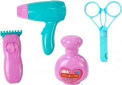 Das Set enthält einen Föhn, Haarschneider, eine Schere und „Parfum“, damit Kinder den Hund kämmen, schmücken und wie im Salon pflegen können.