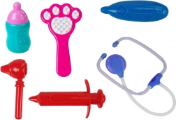 Stethoskop, Thermometer, Spritze, Fütterungsfläschchen, Bürste, Laryngoskop-Spiegel und 2 Gipsverbände – alles für kleine Tierärzte.