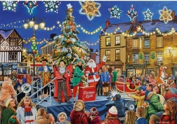 Festlich geschmückter Baum, Lichter und ein Treffen mit Nikolaus/Santa – eine dynamische, detailreiche Szene, die jeden Puzzlefan begeistert.
