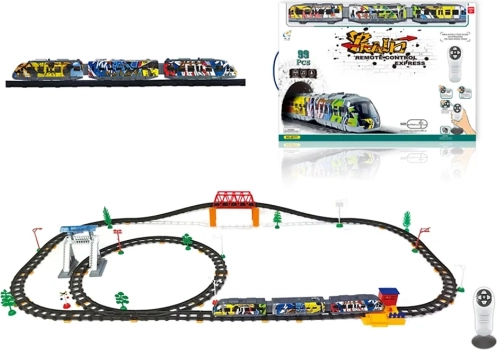 Lieferumfang: Lok, 2 Waggons, Schienen, Schienen, Fernbedienung mit Saugnapf, Bahnhof, Weiche, Bäume, Schilder