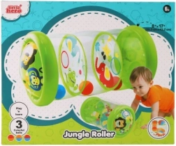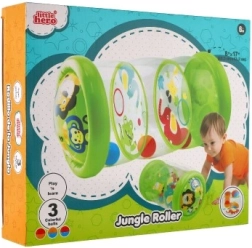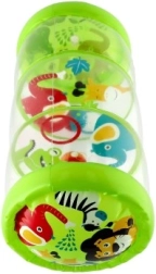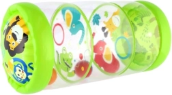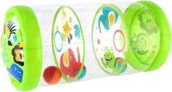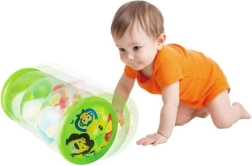 Die Walze ist mit bunten Tierillustrationen verziert und enthält drei Bälle, die beim Bewegen sanft rasseln, was Kinder erfreut und stimuliert.
