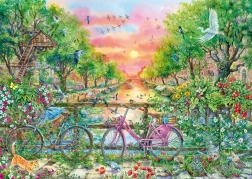 Eine romantische Szene am Kanal mit Fahrrädern, Blumen und Sonnenuntergang bringt eine ruhige Atmosphäre und Freude über das fertige Bild.