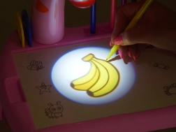 Austauschbare Dias bieten abwechslungsreiche Motive von Tieren, Fahrzeugen, Obst und Gemüse, sodass Kinder nicht nur ihre Feinmotorik trainieren, sondern auch Formen- und Farberkennung. Ein Set mit 12 farbigen Filzstiften, ein Zeichenblock und Halterungen für Schreibutensilien sorgen für Ordnung und schnellen Zugriff.