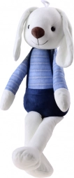 Das Häschen ist etwa 60 cm groß und lässt sich auch von kleinen Kindern gut halten. Die stilvolle Kleidung mit Streifen und die Latzhose verleihen dem Spielzeug eine persönliche Note, die Kinder schnell ins Herz schließen.