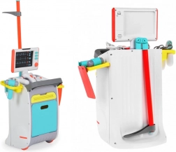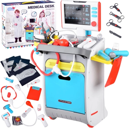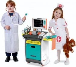 Komplettes Kinder-Arztset auf einem fahrbaren Wagen bietet ein realistisches Doktorspiel bereits ab 3 Jahren. Enthält interaktive Werkzeuge, einen EKG/RTG-Monitor mit Sound, Waschbecken und Instrumenten-Sterilisator, Ablage-regale und Schubladen sowie einen Größenmesser bis 112 cm. Die robuste Ausführung und die bunten Farben fördern kreatives und lehrreiches Spiel.