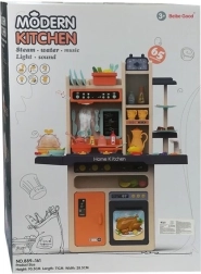 Die Küche enthält leuchtende und klangliche Effekte, die echte Kochgeräusche nachahmen. Kinder können mit Elementen wie Kühlschrank und Ofen spielen, was die Realität und den Spaß des Spiels erhöht.