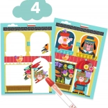 Inhalt des Sets: Collage mit illustrierter Karte, vorgestanzter dicker Pappe und einer Tube Kleber; Filzcollage mit 12 Karten und 4 Bögen selbstklebender Filzteile; Color Stop mit 4 Bögen, Schablone und 4 Farbstiften; Wasserfarben mit Karte und magischem Stift; Farboffenbarung mit 3 Karten mit magischer Beschichtung; Kratzbilder mit 3 Karten und Holzwerkzeug; sowie eine übersichtliche Bildanleitung.