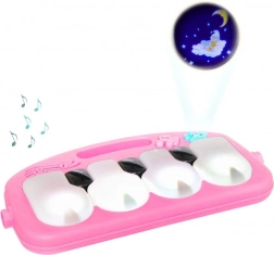 Große Tasten reagieren auf Berührungen und Tritte, leuchten und spielen fröhliche Töne oder beruhigende Melodien ab. Zwei Lautstärkestufen für das Spielen zu Hause und vor dem Schlafengehen.